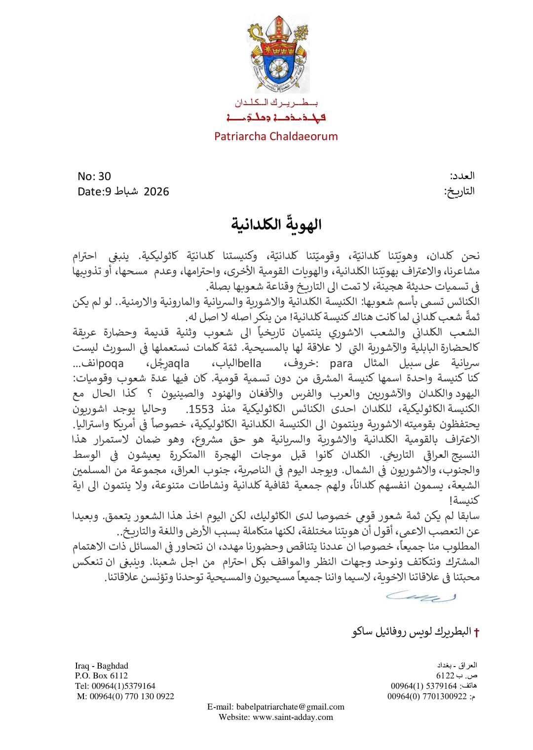 Letter from Cardinal Louis Raphael Sako, Chaldean Patriarch of Baghdad, Iraq