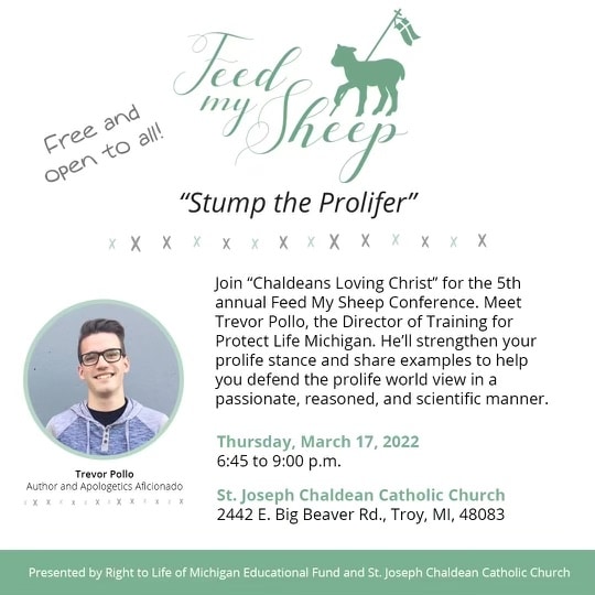 Join “Chaldeans Loving Christ” for the 5th Annual Feed My Sheep Conference. Meet Trevor Pollo, the Director of Training for Protect Life Michigan. He’ll strengthen your pro-life stance and share examples to help you defend the pro-life world view in a passionate, reasoned, and scientific manner. The talk will be on Thursday, March 17, 2022 at 6:45 at St. Joseph Church.