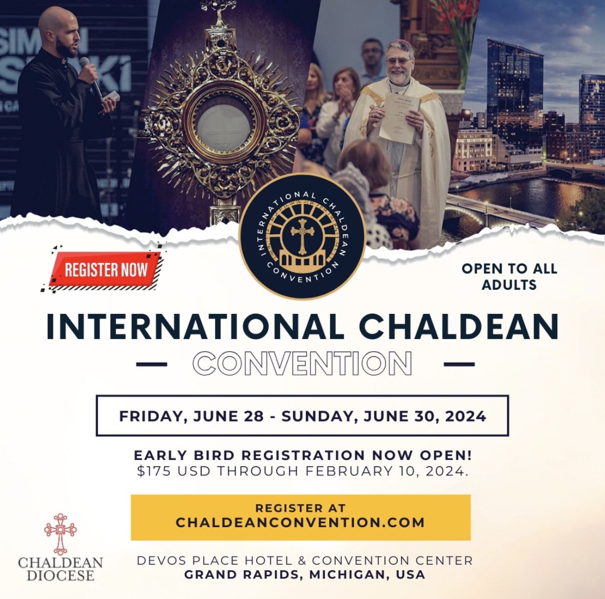 Our diocese is excited to announce that we will be hosting the first ever International Chaldean Convention next summer! The convention is open to all adults and will be on June 28-June 30, 2024 in Grand Rapids, MI. Registration is open now! Make sure to follow the diocese social media pages and visit chaldeanconvention.com to register and for more updates!